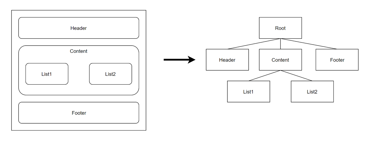 - 화면을 왼쪽같이 구성하면 오른쪽과 같은 컴포넌트 트리 구조를 가지게 됨