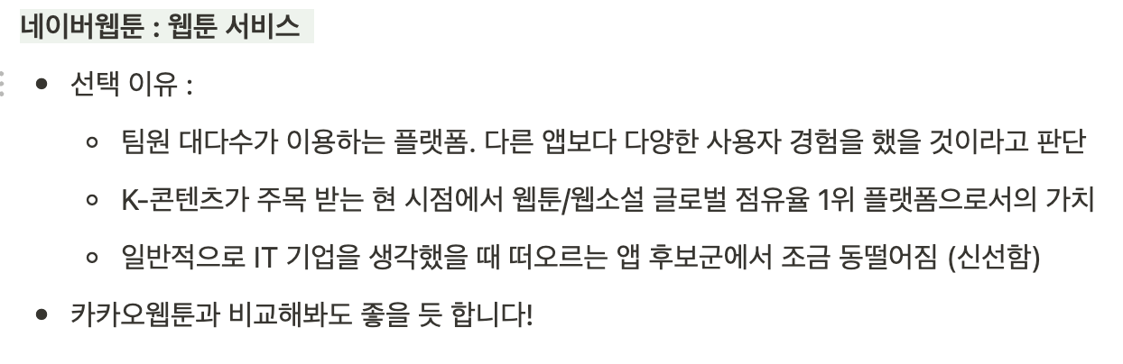 보통 현업에서는 회사의 경쟁사 혹은 유사한 도메인에 있는 서비스를 채택하겠지만 아직 소속이 없으므로 위와 같은 이유로 '네이버 웹툰'을 선택하게 되었다.