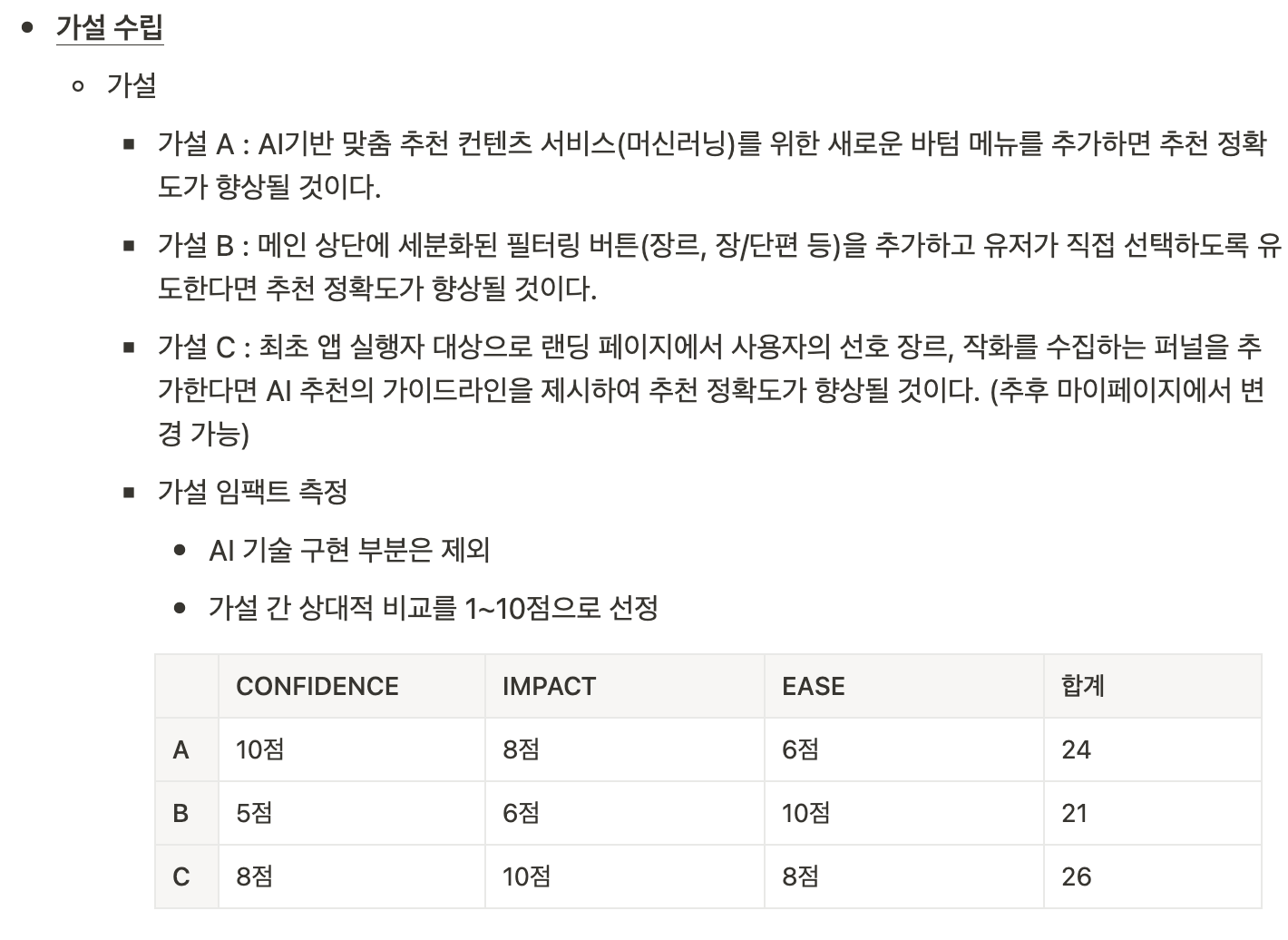 다양한 솔루션 가설이 나왔다면 I.C.E 프레임워크 활용하여 우선순위를 책정해볼 수 있다.