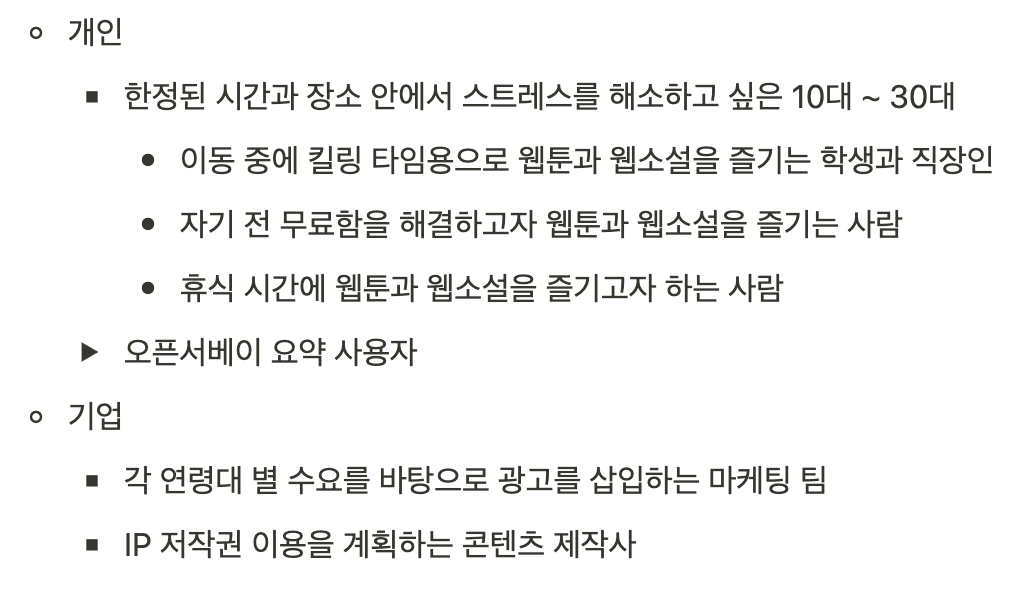 핵심 유저 설정 시에는 서비스를 이용하는 유저의 유형을 개인부터 기업까지 다양하게 고려해봐야 한다.