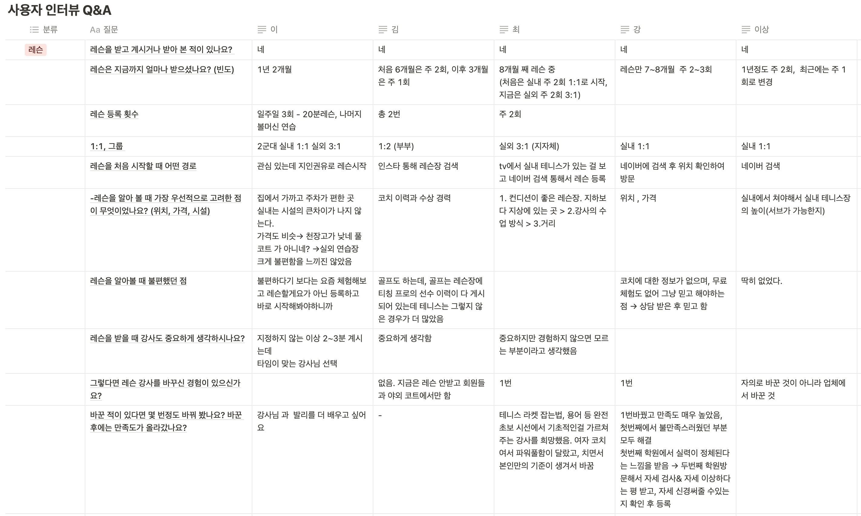 테니스 레슨을 구하는 데 다양한 어려움이 있음을 발견했고, 특히 테니스 강사와 관련하여 여러가지 페인포인트를 찾아낼 수 있었습니다.