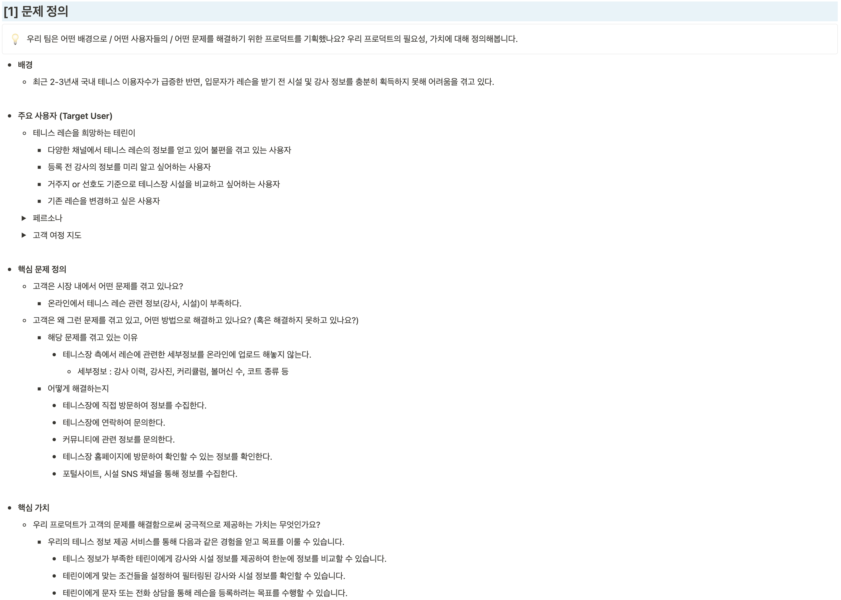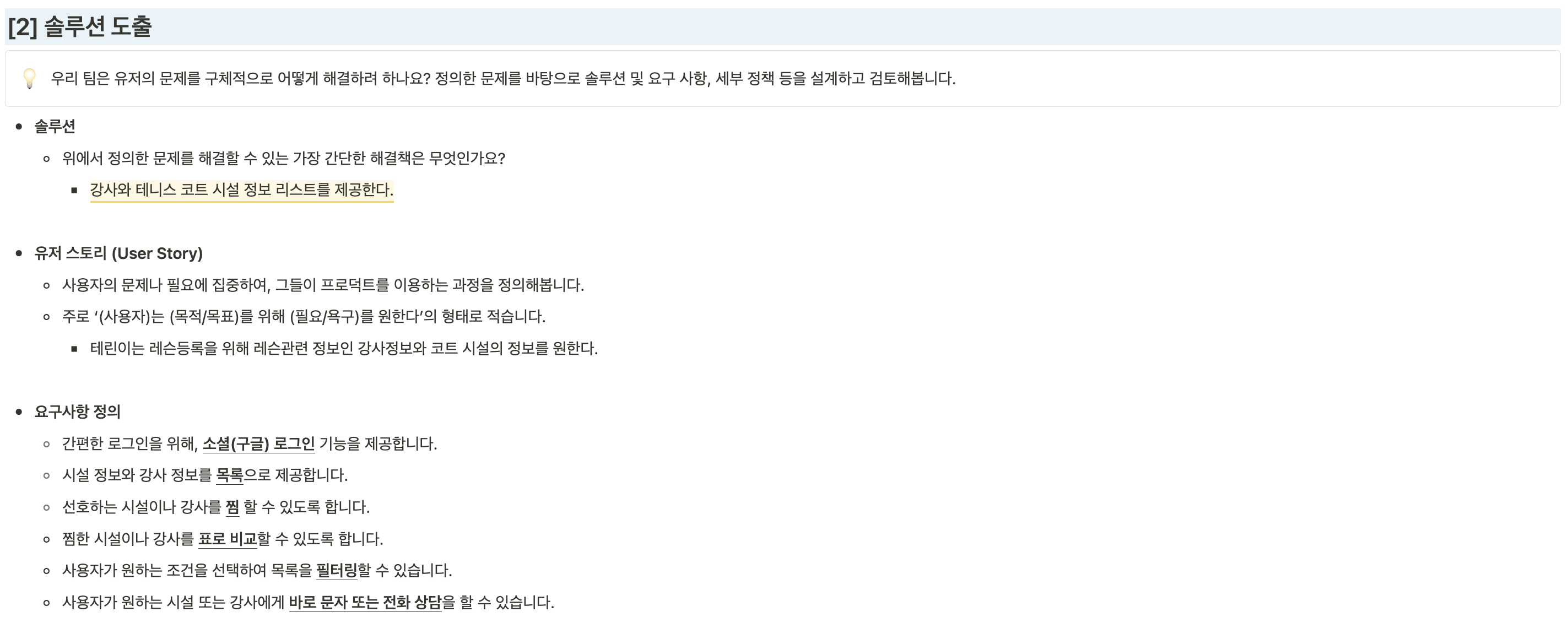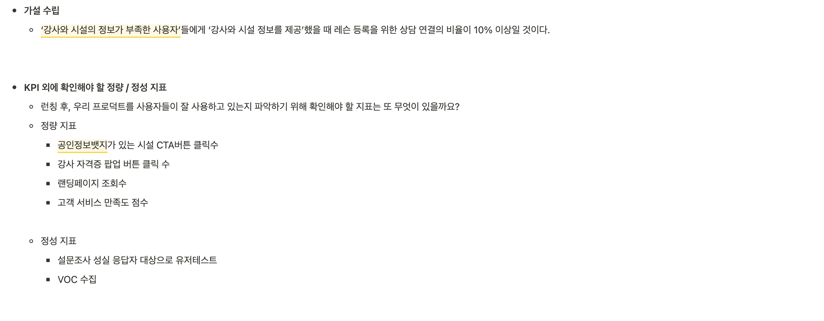 이 가설을 검증하기 위해 레슨 정보, 강사 정보, 시설 정보를 한 곳에서 다 볼 수 있도록 모아주는 서비스를 솔루션으로 정했습니다.