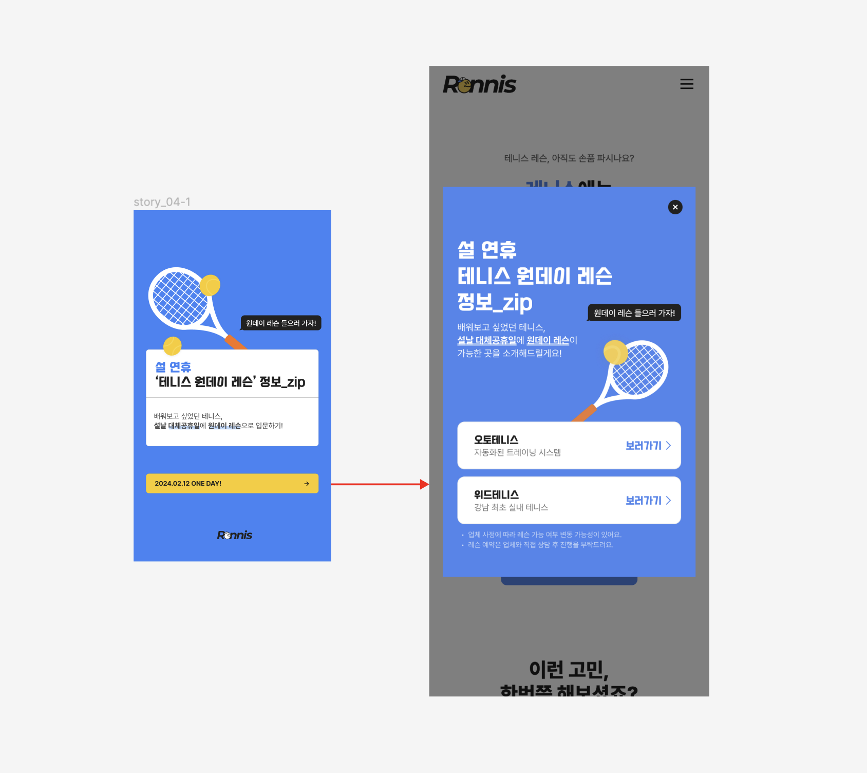 인스타그램으로 광고 소재를 띄운 후 저희 서비스 랜딩페이지 팝업에서 해당 테니스장에 대한 정보를 볼 수 있도록 유도했습니다.