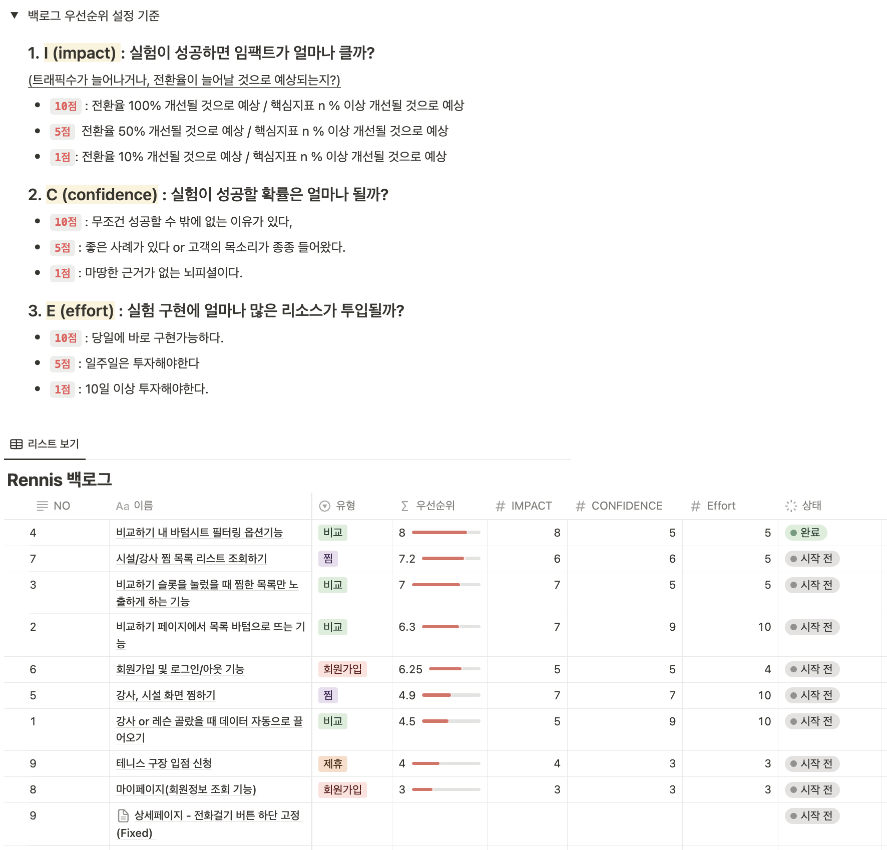 이것을 관리하기 위해 백로그 리스트를 만들고 ICE 프레임워크를 이용하여 우선순위를 측정했습니다.