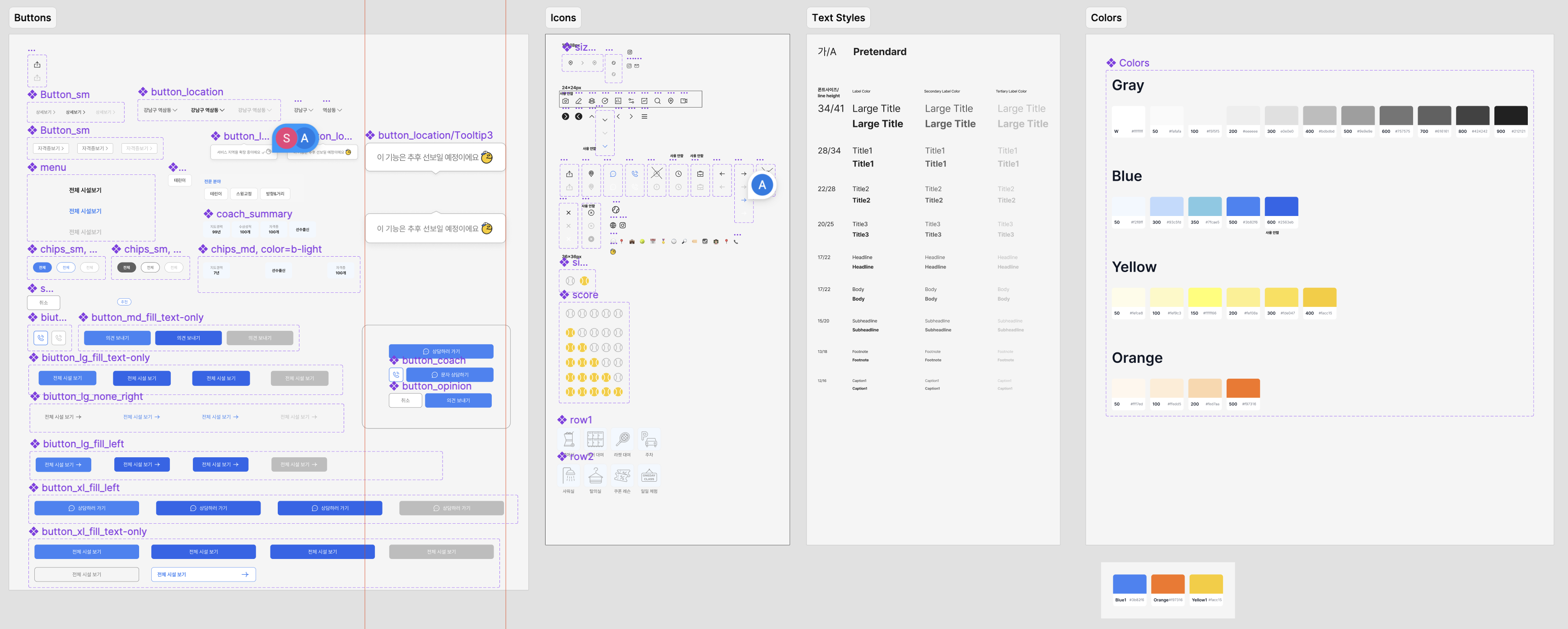 효율적인 개발 협업을 위해 컬러값과 폰트 스타일, 버튼 스타일, 아이콘들을 컴포넌트화하여 관리하고 있습니다.