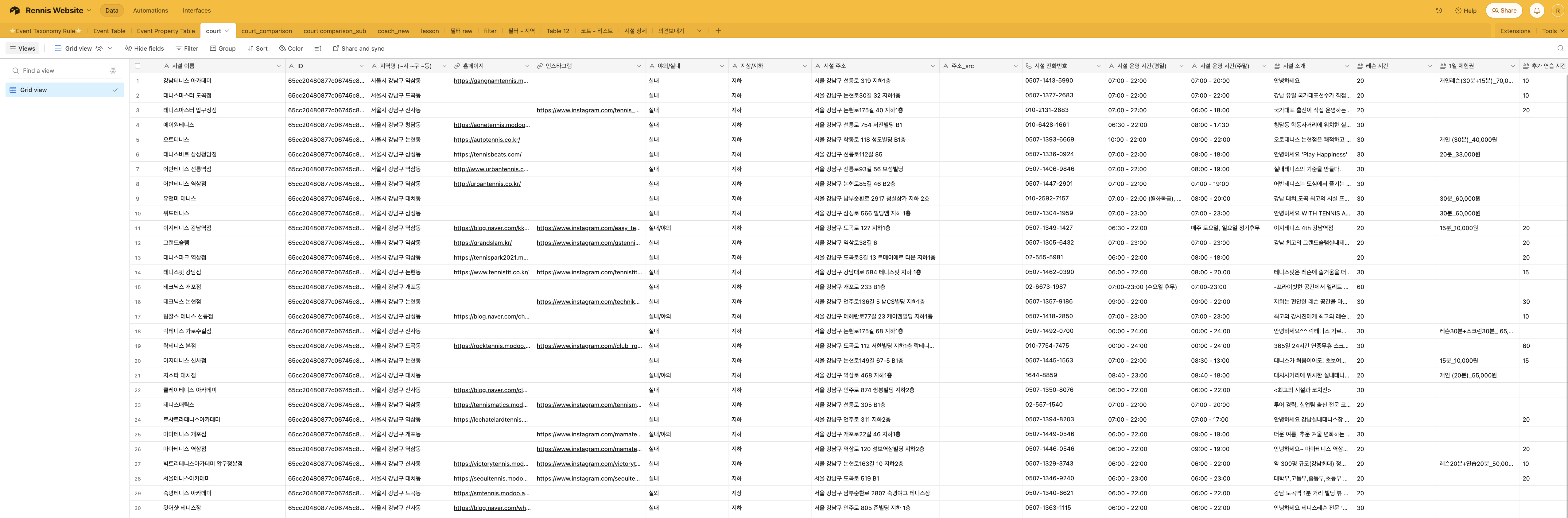강남구 소재 테니스장 40여 곳을 리스트업하고 테니스 레슨에 관련한 데이터셋을 만든 후 채워넣기 시작하였습니다.