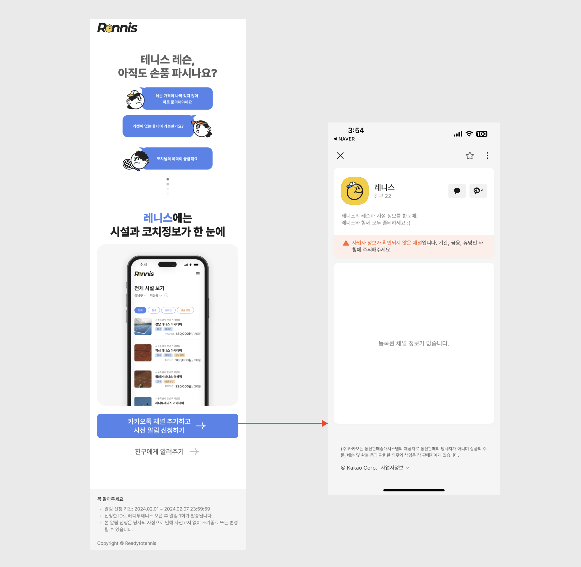 레니스가 어떤 서비스인지 소개하는 랜딩페이지를 간단하게 만들고 사전 알림 신청 시 카카오톡 비즈 채널로 연결되어 레니스 계정을 친구로 추가하도록 유도했습니다.