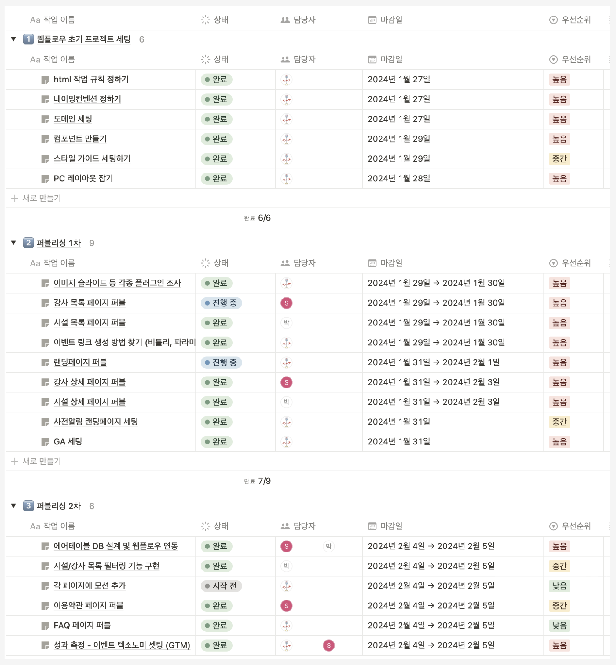 저 역시도 이번 런칭을 위해 필요한 작업들을 하나씩 나열하고 우선순위가 높은 작업들을 앞에 배치한 후 담당자, 마감일을 세팅해주었습니다.